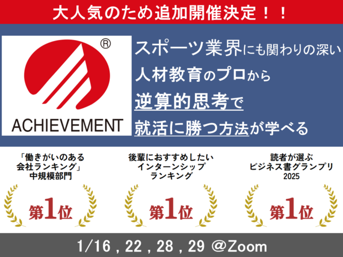 - この説明会では、スポーツにも通ずる心理学を応用し、就活に勝つ逆算的思考を学べる。インターンでは、あなたの内なる「使命」や「志」と向き合い、いかなる困難な状況でも、自分の決断を正解にしていく力「自創力」を磨ける。