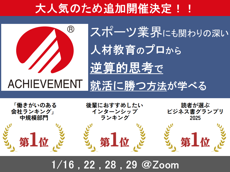 ≪ 27卒 | 大好評の為追加開催!! | 志望度不問 ≫ スポーツ業界に深く関わる人材教育のプロから、就活に勝つ逆算的思考を学べる | 働きがいのある会社第1位の超人気企業!! | アチーブメント内定直結型説明会@Zoom