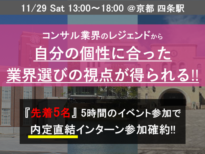 ≪ 27卒 | 先着5名 ≫ 昨年1年で350名動員の超人気セミナーに “無抽選で参加” 確約!! | コンサル業界を創ってきたレジェンドから自分に合った業界選びの視点を学べる | 11.29@京都 四条駅近辺