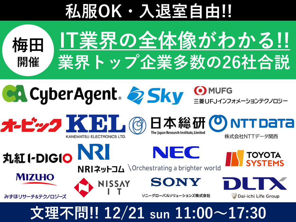≪ 27卒 | 12/21@梅田 | 入退室自由 ≫ 1日で様々な業界・企業の情報収集が可能!! | 平均年収1,000万以上の企業参加あり | IT業界の全体像がわかる26社合説 | 私服OK