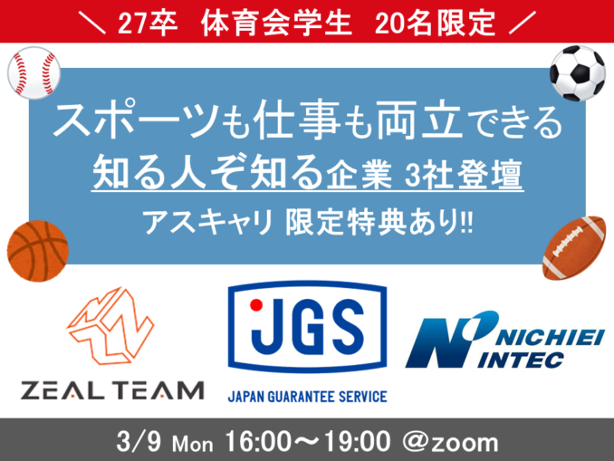 - 体育会所属学生限定のイベント!「体育会学生のどこをみて採用してるのか」など、今後の選考に役立つ情報も得られる。