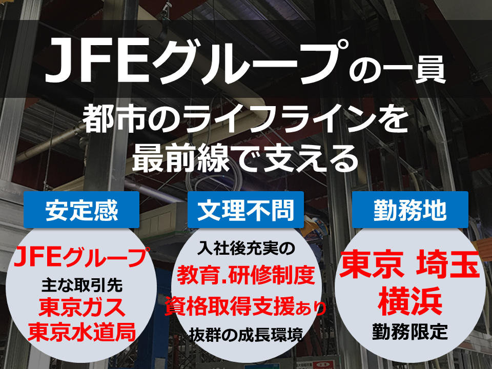 ≪ 27卒 | 文理不問!! ≫ JFEグループの一員 | 東京ガス認定のスーパー工事会社 | 都市のライフラインを最前線で支える | 首都圏勤務 | 土日祝休み | 年間休日120日 | あすか創建