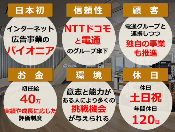 - 日本初のインターネット広告事業を始めた企業。NTTドコモグループ・電通グループの傘下。ただグループに依存はしておらず、独自の商流とクライアントを持つ。