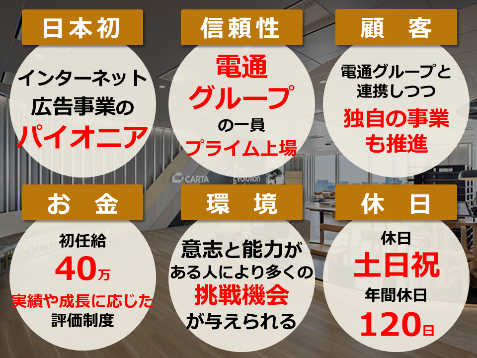 【26卒】電通グループ・プライム上場企業 | 初任給40万 | 人より速く、高い成長を求める人には超魅力的な挑戦環境!! | 日本初のインターネット広告事業を始めた企業 | CARTA HOLDINGS
