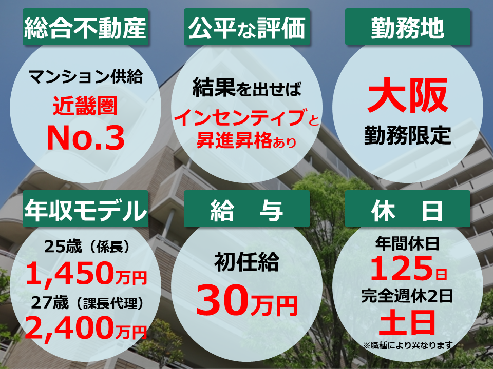 ≪27卒 | 大阪勤務、転勤なし≫マンション供給近畿圏第3位 | 初任給30万+手当 | 結果を出せば上限なく支給、1年目で年収1,000万も目指せる | 年間休日120~125日 | エスリード