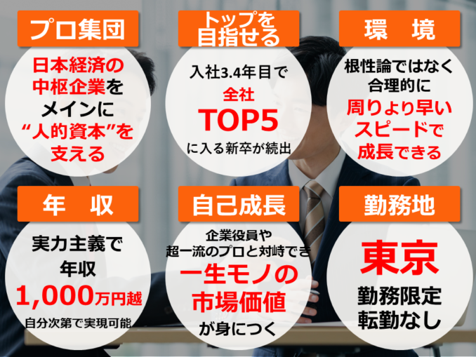 - 「早くから突き抜けたい」「正当な評価が欲しい」「経営に近い場所で勝負したい」そんな野心を持つ人は、企業の意思決定層や超一流のプロと対峙できる。その経験を通じて「視座」と「論理的思考」が大きく引き上げられ、一生モノの市場価値が身につく。