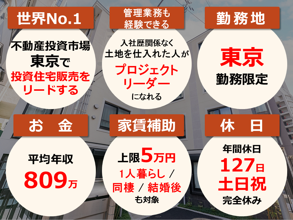 ≪ 27卒 | 東京勤務限定 ≫ 世界No.1の不動産投資市場東京で投資住宅販売をリードする企業 | 土地仕入れから物件販売までを担う | スタンダード上場 | 平均年収809万 | 年間休日127日 | 土日祝完全休み | 明豊エンタープライズ