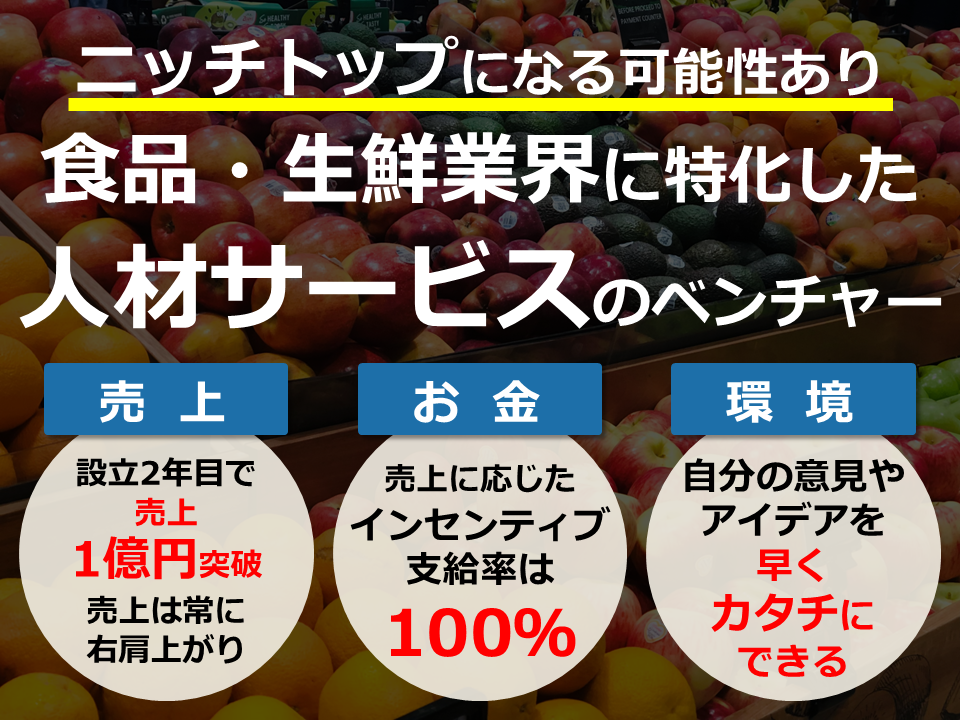 ≪ 27卒 | 東京勤務・転勤なし ≫ 食品・生鮮業界に特化した人材紹介サービスを提供するベンチャー企業 | 設立から毎年黒字経営。売上は常に右肩上がり | 個人の成果がダイレクトに報酬へ反映される | オイシル