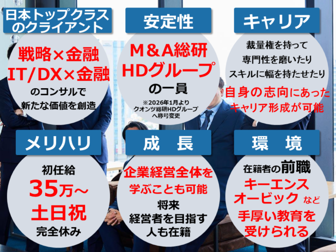 1. M&A総研HDグループ(2026年1月よりクオンツ総研HDグループへ称号変更)の一員として、日本トップクラスのクライアントに対して、IT・DX戦略の立案や最先端技術の導入など、上流から下流に至るまで、領域を問わずコンサルを行う。クオンツでしかできない「戦略・IT/DX×金融」で新たな価値を創造する。